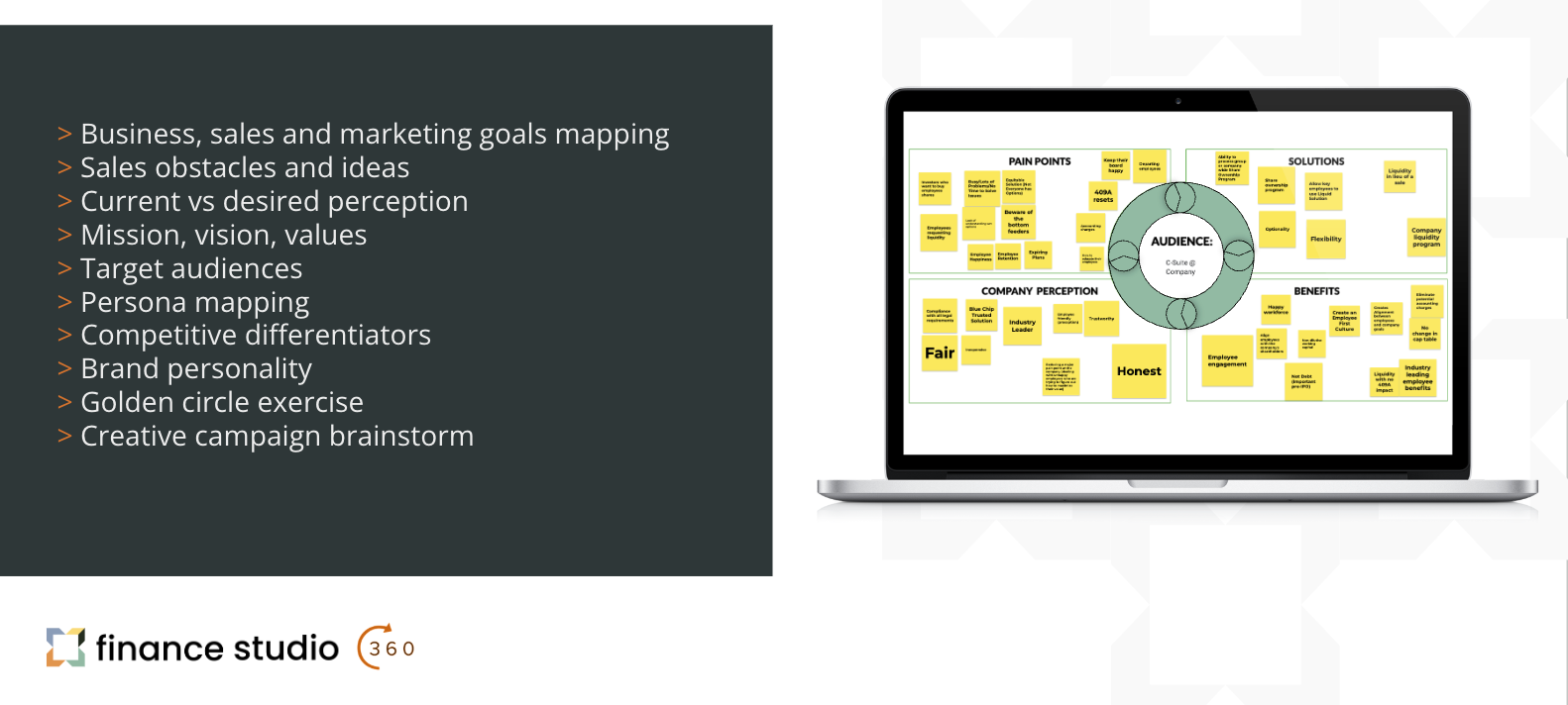 These sessions are not about picking colors or logos. They’re about getting to the root of why your firm exists, how it creates value, and what makes it meaningful in a sea of financial sameness.
